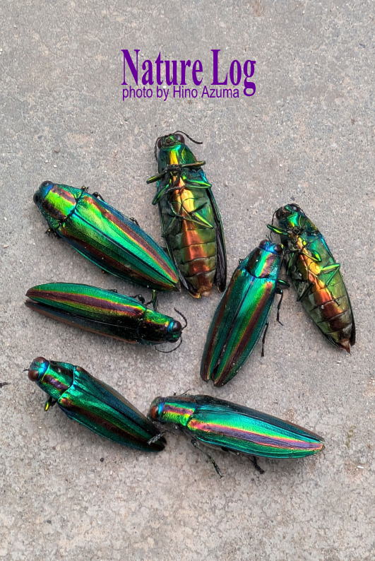 今夏、敷地内で見つけたタマムシの死骸。見つけるたびに拾ってまとめておいたのだが、計7匹にもなった。実際は、拾わなかったのも2~3匹いた。なので計約10匹というわけ。これはもう玉虫厨子を作るしかないな(笑)。死骸だけではなく、生きている個体も結構見かけた。年々増えている印象だが、タマムシだらけになったら、それはそれでちょっと困るけどね。それにしても金属光沢のような彩色がホント美しい昆虫だよな。うちはカブトムシやクワガタムシもいれば、タマムシもいるんだよね。考えてみれば、生物好きにとっては恵まれた環境かもね。