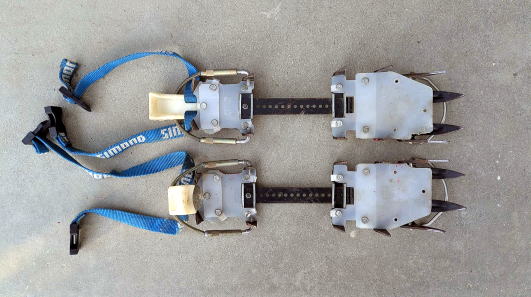 久しぶりに倉庫から出してきて撮影。アイゼン裏側に取り付けてある白い部分が、着雪防止樹脂板。先の方のアルミ爪はすべてとれちゃっている。雪団子にならないので便利は便利だったが、耐久性はあまりなかった。