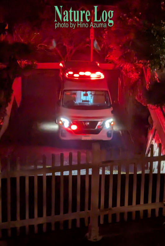 近所の家で急患か。しかし、あたりに救急隊員の姿はない。どうも近所は近所でも、うちに隣接する家ではなく、徒歩数分のところに道路に接しておらず車が入れない家が何軒かあって、そこに徒歩で向かわれたようだった。あとでネットワークカメラ画像を確認すると、数人の救急隊員が空のストレッチャーを押しながら向かう姿が映っていた。