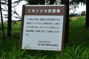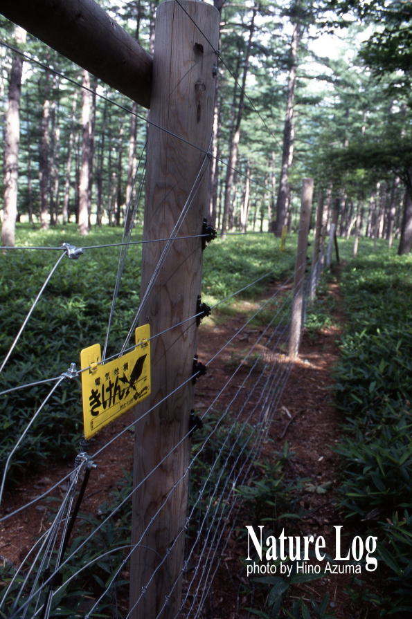 私の記憶では、1999年に奥日光・小田代ヶ原でシカ用の防獣電気柵を見たのが最初だったと思う。メイン写真はその時に撮影したものだが、こんなものまで作らなければならないほどの状況なのかと、ちょっと驚いた。そばにある説明板には「平成9年度事業」とあり、設置されたのは1997年だったのだろう。