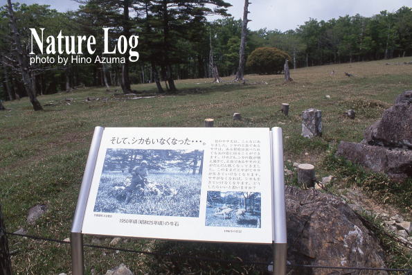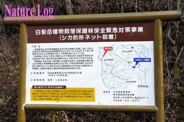 似たような解説板はあちこちで見る。これは熊本県の白髪岳で見かけたシカ防除ネット設置の説明板。これによるとネットの規模は延長1キロにも及ぶものらしい。撮影は2014年。