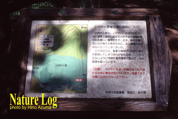 小田代ヶ原植生復元施設(電気柵のこと)の説明板。