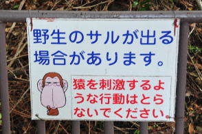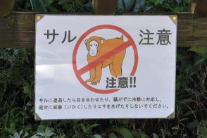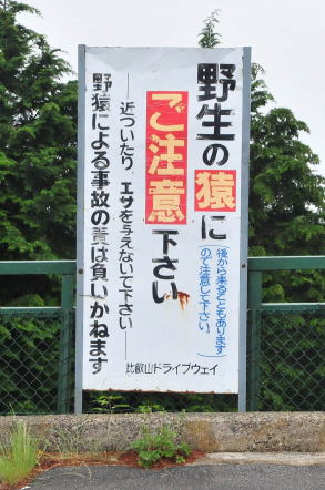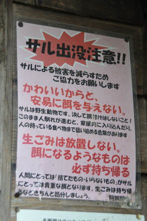青森県西目屋村。白神山地・暗門の滝入口(左)。餌付け禁止ではないが、サルを刺激する行動をとらないように注意を促す看板。香川県小豆島・寒霞渓で(右)。