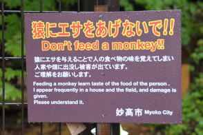 そんなこともあってサルの害が深刻化している場所では、観光客や登山客に対して周知を計るため餌付け禁止看板を設置している。その看板を比較すると、それぞれ文言に工夫がこらされていることを感じさせる。私が過去に見かけたサルの餌付け禁止看板を比較してみたい。