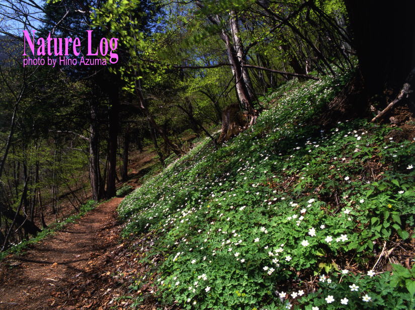 ![]() 表参道沿いに群生するニリンソウ。周囲の新緑も目に眩しい(2003.04) |
