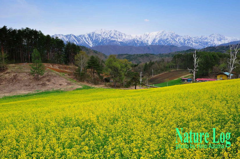 ![]() 満開となった中山高原のナノハナ。バックは左から爺ヶ岳、鹿島槍ヶ岳、五竜岳(2012.05) |