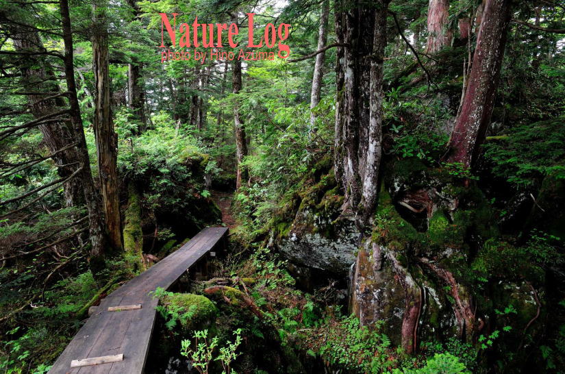 ![]() 溶岩の上に根を張るクロベの間を桟道で抜ける。探検気分で散策したい(2012.06) |