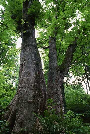 山形県小国町のブナ林に生えたトチノキの大木(左)。円錐花序を多数つけたトチノキ。6月下旬。長野県・奥志賀高原にて(右)。