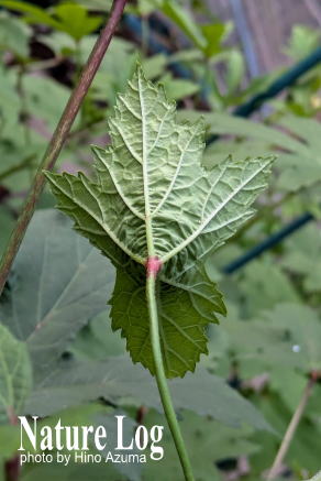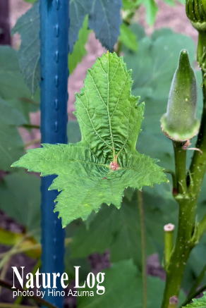 自生植物ではないが、先日、うちの防虫ネットハウス内で栽培中のオクラのひと株に奇妙な葉があるのに気づいた。オクラといえば掌状に5裂する葉で柄は葉の基部から出ているが、見かけた葉は楯形で葉の中心部から柄が出ていた。こんなオクラの葉は初めて見た。表側と裏側から撮影したが、ハスの葉と同じく楯形だとわかる。