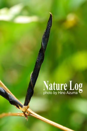 若い豆果(左)。熟して黒くなり、ねじれて弾き飛ぶ直前の豆果(右)。カラスノエンドウは、この黒い色をカラスに見立てた名前。どちらも広島市。