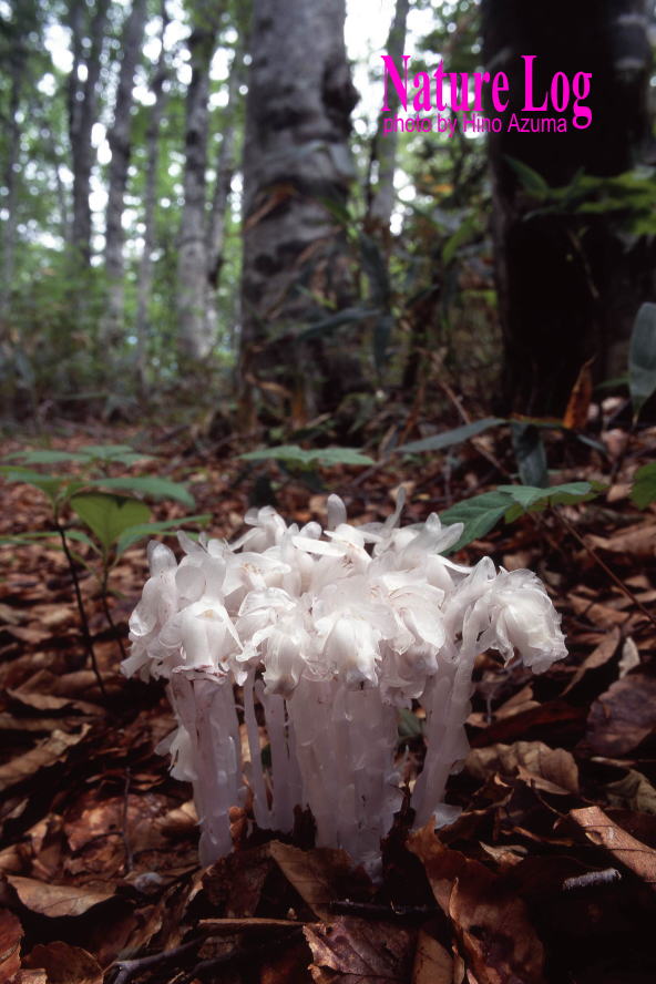 ブナ林の林床に群生するギンリョウソウ。わずかにベスト時期を逃したようで、左側のように一部、痛みかけていたが、それでも数が多くて見事だった。なので67判カメラを三脚にセットしてブレないようにシャッターを切った記憶がある。長野県木島平村・カヤノ平。