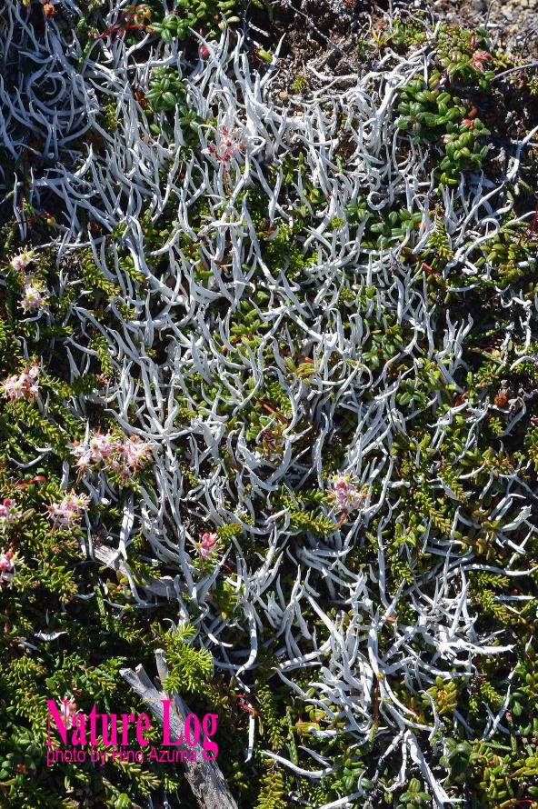 チシマツガザクラやコケモモの間に異様な姿を見せるムシゴケ。どう見ても「わき出してくる大量の回虫」である。この意外過ぎる形態と真っ白な色がおもしろい。