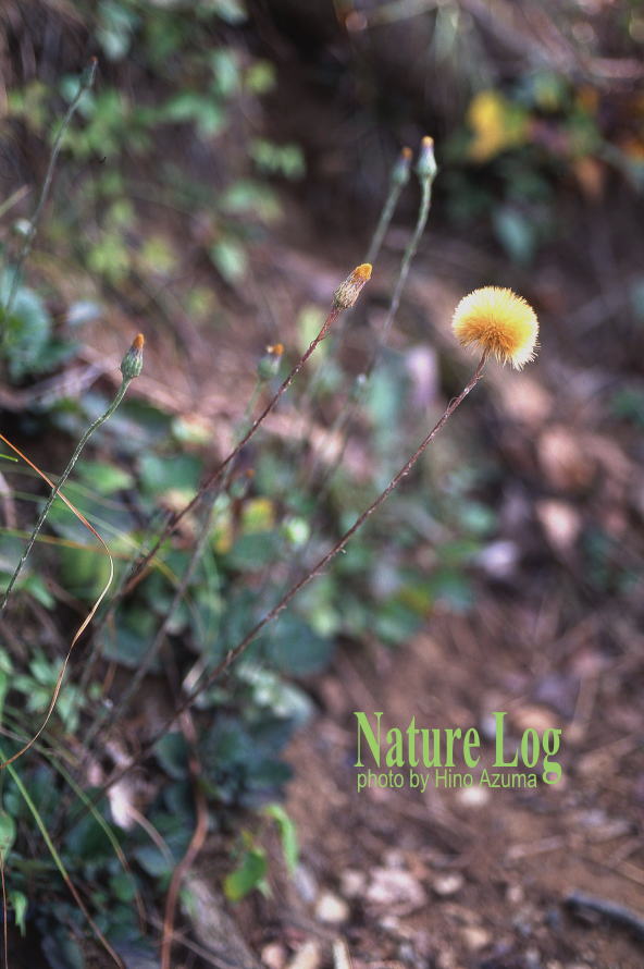 4月、サクラが咲く頃に高尾山から城山へ向かう奥高尾縦走路上で見かけたセンボンヤリ。春型なので葉は小さく花茎も短い。