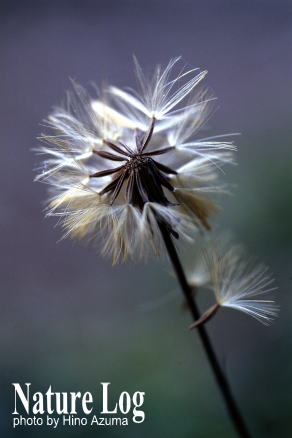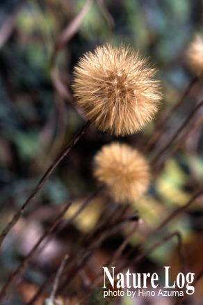開いた冠毛をアップ。11月下旬、東京都八王子市・多摩森林科学園(左)。飛びかけているそう果。11月中旬、奥多摩・金比羅山(右)。