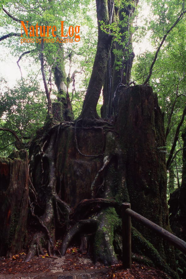 切株の上に新しい世代の木が成長した切株更新。ヤクスギランドで。