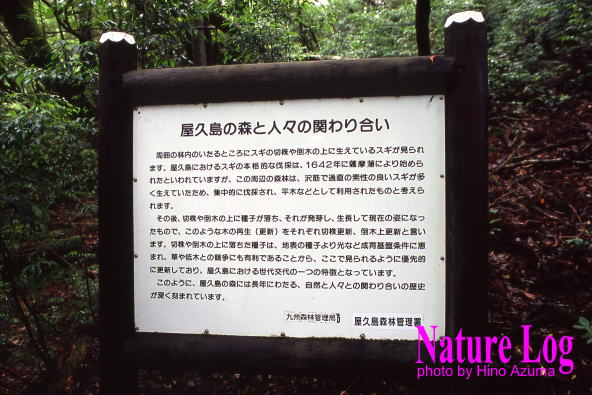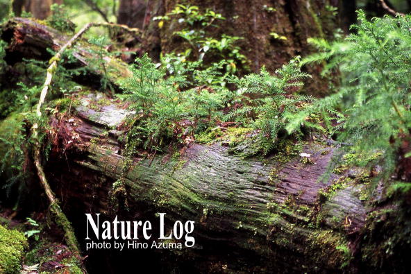倒木上でスギの幼木が育ちつつあった。同じくヤクスギランドで。