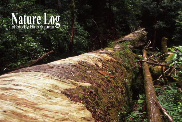 ヤクスギランドで見かけた倒木。表面はあまり苔が覆っておらず、倒れてまもないと思われる。