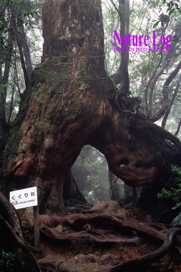 白谷雲水峡の遊歩道上にまたがる「くぐり杉」。根元に倒木が残っていないので腐りやすいツガの倒木上に育ったと考えられているそうだ。ちなみにヤクスギランドにも同名のスギがある。