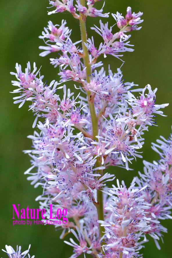 花序。花は通常は淡紅色だが、個体により濃淡がある。左の花序は淡くて白に近い。もっと白いものも稀にある。北志賀の三ヶ月池湿原で撮影。
