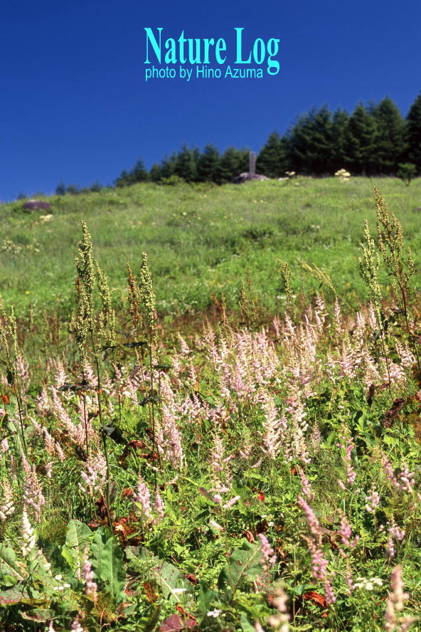 8月の霧ヶ峰で見かけた本種の群生。一帯に帯のように広がっていた。後ろに立つのは史跡・旧御射山(もとみさやま)競技場跡の石碑。