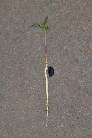 ヤブツバキの実生。畑の草を抜いている時にヤブツバキとも気づかずに引き抜いたら、スルッと根まで簡単に抜けて、種子の形でヤブツバキだとわかった。一直線に地下へとのびる直根ぶりに注目してほしい。 |
