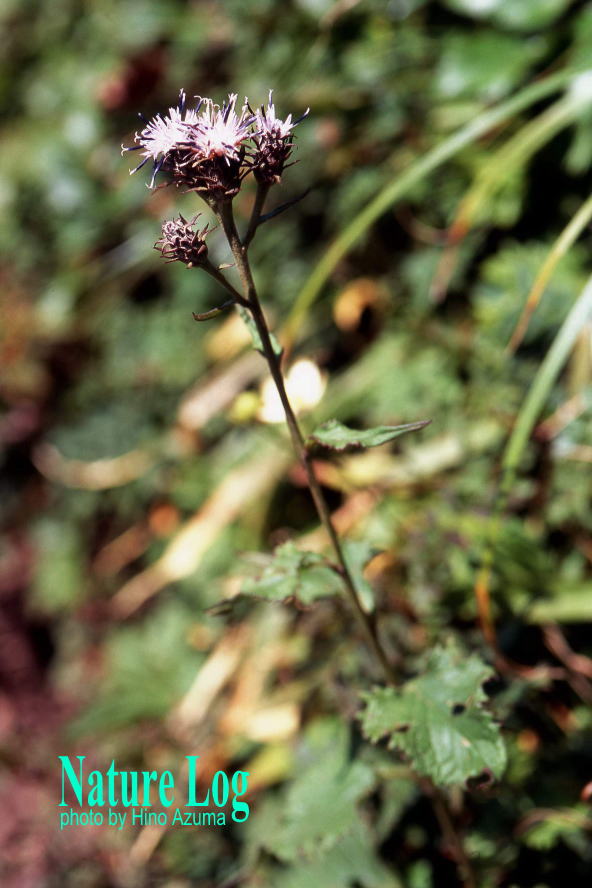 高さは40~60センチ。葉は互生し、卵形~三角状卵形で、縁には鋸歯がある。8~9月に茎頂に薄紅紫色の筒状花のみからなる頭花が2~3個つき、暗紫褐色の総苞にはくも毛があり、総苞片は7~8列。