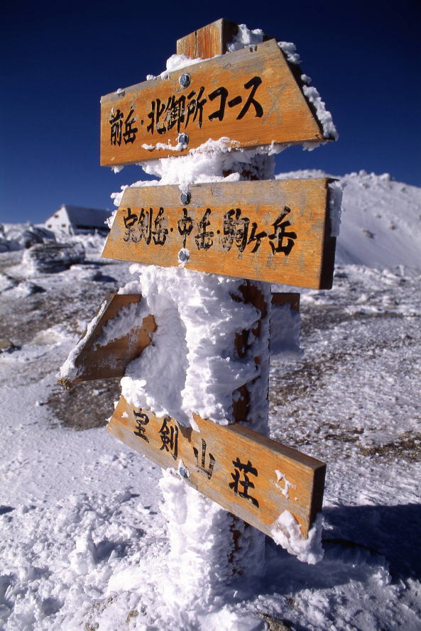 ![]() 尾瀬ヶ原の西の玄関口・山の鼻に立つ道標。支柱や文字板はどちらも木製。文字部分は白ペンキでそのまま書いてあるわけではなくて、彫り込み文字になっていて、その凹部に白ペンキが塗ってある。そのまま書くよりもペンキが剥がれにくいからだろう。かなり手間がかかる製作方法が採用されていることがわかる。尾瀬を歩く人の中で、これに気づいている人ってどれくらいいるだろうか? 2010年撮影。 ![]() 1995年に北海道の羊蹄山で撮影した道標。これはペンキで手書きされたもの。 ![]() 文字板が支柱から外れて、近くの朽ちかけた株の上に置かれた道標。1999年に会津駒ヶ岳で。 ![]() 尾瀬ヶ原・竜宮十字路の木道上に設置されたユニークな道標。尾瀬ヶ原には普通の道標も立てられているが、こんなタイプもある。2012年撮影。 ![]() 野反湖と大沼池を結ぶ上信国境の稜線上、木に打ち付けられた道標。昔は、道端の木に直接、釘で打ち付けられた道標はよくあったが、最近は減った。やはり木に負担をかけるからだろう。2010年撮影。 以下2点NEW ![]() 以前は時々見られた「木に打ち付けられた道標」の例1。屋久島・太忠岳で。撮影は2006年。 ![]() 「木に打ち付けられた道標」の例2。秋田県の森吉山で。撮影は2002年。 ![]() 同じく上信国境のカモシカ平で見かけた道標。2010年撮影。 ![]() 富士山の宝永第1火口縁分岐に立つ道標。世界中から登山者がやってくる山だけあって、英語と韓国語も併記。木や金属板を組み合わせて作られていた。2015年撮影。 ![]() 湧き立つ雲を背景に。長野県松本市・美ヶ原で。2009年撮影。 ![]() 槍ヶ岳と道標。北アルプス・燕岳の合戦尾根で。 NEW ![]() 冬季の道標は、時にこんな感じで着雪しちゃう。この道標の場合は、おそらく登山者が指示板の文字を読もうとして雪を取り除いたのだろう。山によってはシーズンオフ中に傷まないように指示板が取り外されることもあるが、中央アルプスのように冬季も登山者が多い場所ではそのままにされることもある。撮影は1994年。 ![]() 奈良県天理市と桜井市を結ぶ山の辺の道の道標。道路上に設置され、矢印でルートを示してあった。シンプルだが、山の辺の道のように市街地や田園地帯を歩くコースでは、これでも十分。2015年撮影。 ![]() 山の辺の道には、もちろん普通の道標もある。2015年撮影。 ![]() 京都と小浜を結ぶ「鯖街道」の道標。海産物を京へと運んだ若狭街道のことで、鯖街道というのは近年になってからの命名である。2011年撮影。 ●積雪期←→無積雪期の道標