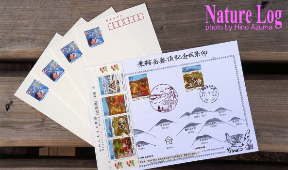 同簡易郵便局で買った登頂記念風景印の切手とハガキセット。撮影は2005年。