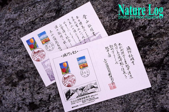 立山山頂簡易郵便局で販売されていた立山連峰越えの通行証明書と登山証明書。撮影は2005年。
