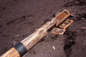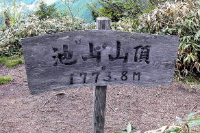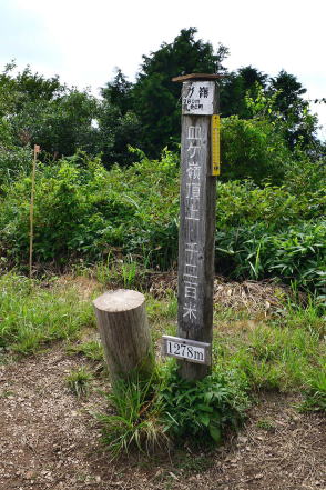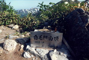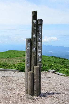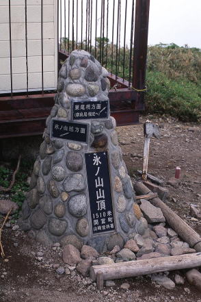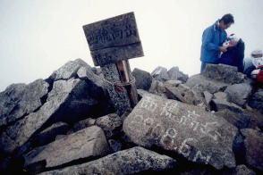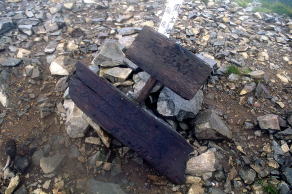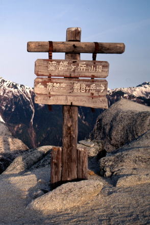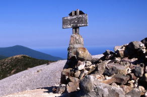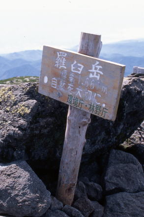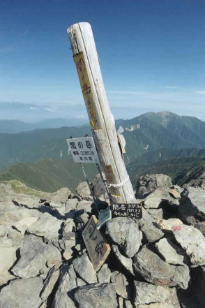 ![]() 北アルプス・北ノ俣岳の山頂標識。一応、標柱タイプとしたが、文字を彫り込んだ板を角材に縦に取り付けてあった。腐食しにくいように金属製の屋根付き。バックは薬師岳。撮影は2015年。 ![]() 北海道蘭越町と岩内町にまたがるニセコ高原のチセヌプリの山頂標識。撮影は1995年。