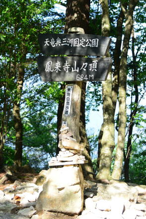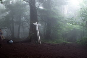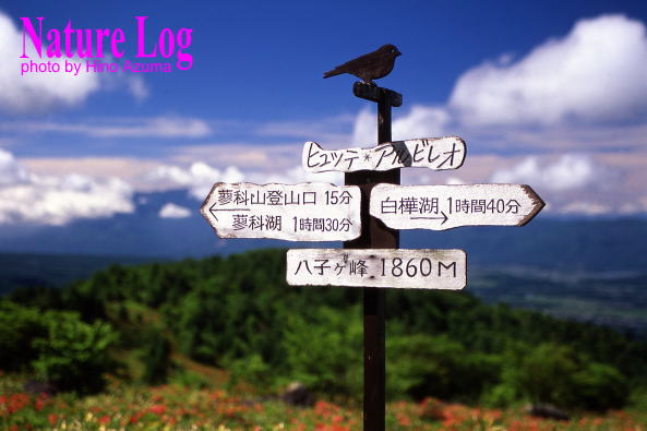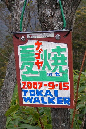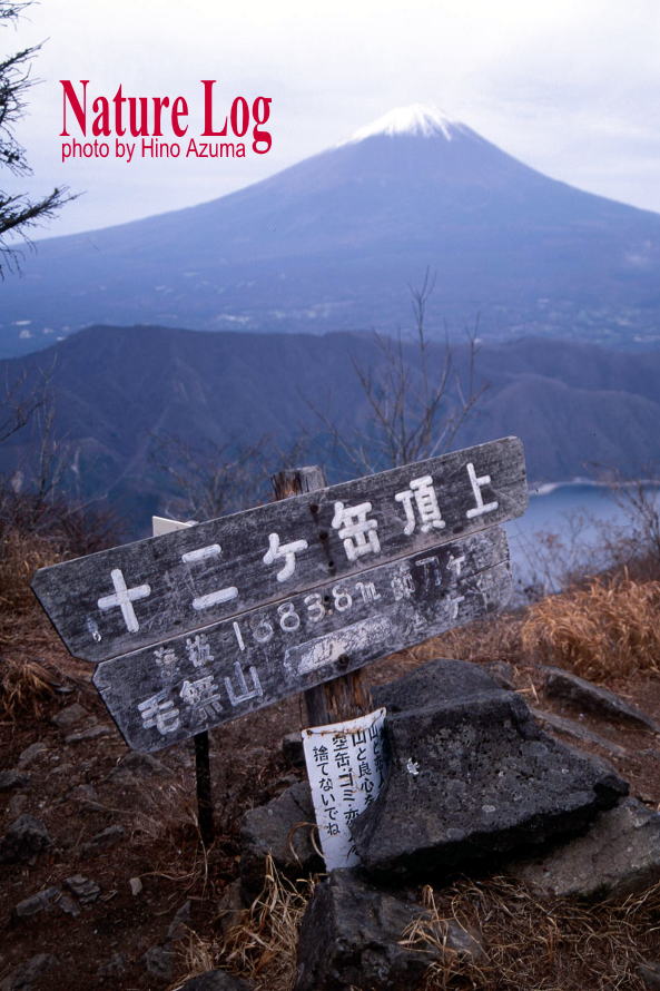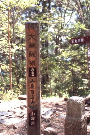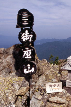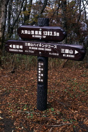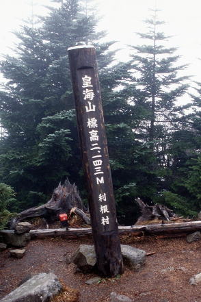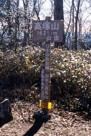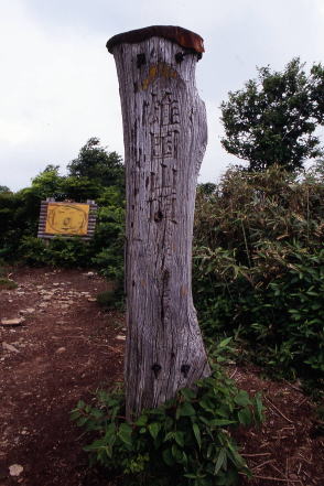 ■看板タイプ ![]() 山梨県富士河口湖町。御坂山地・十二ヶ岳(じゅうにがたけ)の山頂標識と富士山。撮影は1993年。 ![]() 富山県富山市と岐阜県飛騨市にまたがる白木峰の山頂標識。支柱も表示板もコンクリート製だが、表示板は年輪まで再現した手のこんだものだった。撮影は2009年。 ![]() 長野県茅野市と立科町の境になだらかな山容を見せる八子ヶ峰。2003年に取材した際。その山頂にあった標識。近くの山小屋・ヒュッテアルビレオのお手製と思われる。先には鳥の飾りまで付けられ、センスは抜群。標識自体が絵になるのは珍しい。