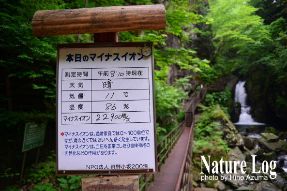 2015年に取材で三ツ滝を訪れた時に見つけたのが、マイナスイオン数の掲示板。地元のNPO法人が毎朝、ここでマイナスイオン数や天気、気温、湿度を計測して、この掲示板に書き込んでいるようだった。それによると、当日のマイナスイオン数は1ccあたり22900個だという。