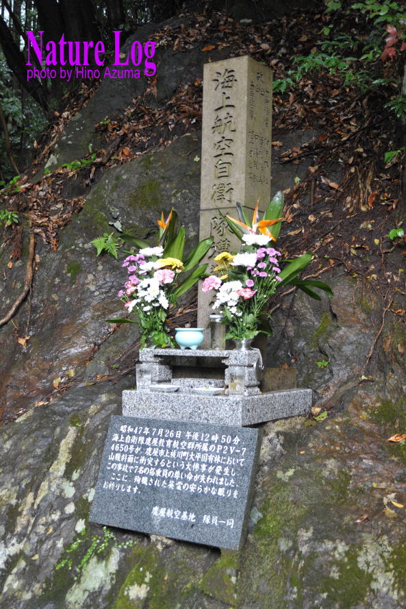 日本航空123便墜落事故は、今なお多くの人々の記憶に残るが、山岳地が現場となった航空機事故は過去にもあった。2014年秋に取材で訪れた高隈山の上祓川コース登山口には、トップ写真の海上航空自衛隊遭難碑が建立され花が手向けられていた。1972(昭和47)年7月に海上自衛隊鹿屋教育航空群所属の飛行機が御岳山腹に激突する事故があり、7名の搭乗員が亡くなられたそうだ。当時はトップニュースで報道されたはずだが、すでに50年以上も経過し、事故の記憶は風化しつつある。かろうじて、こうした石碑によって、かつて悲惨な事故があったことを知ることができる。