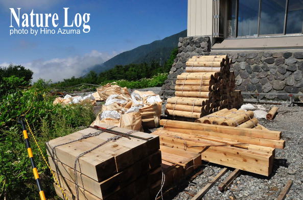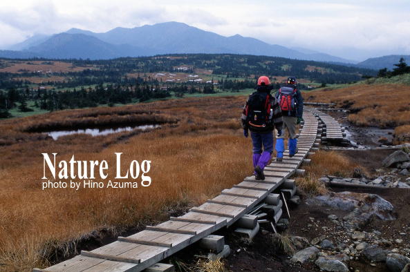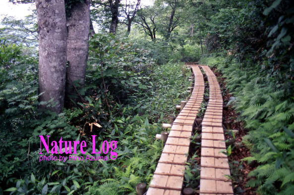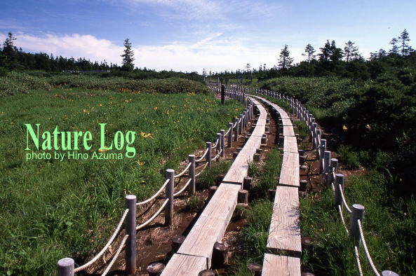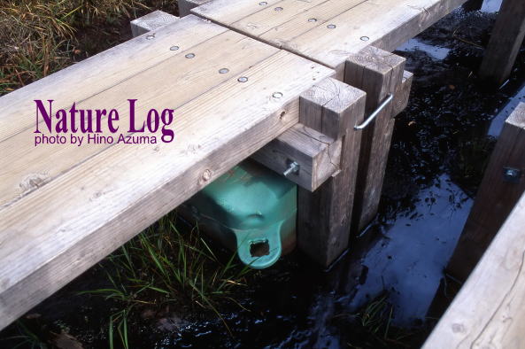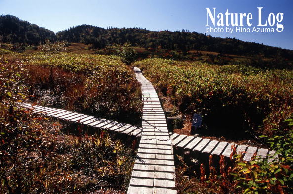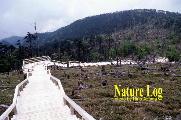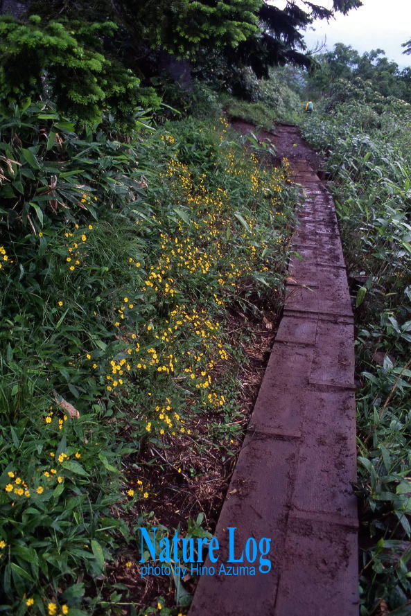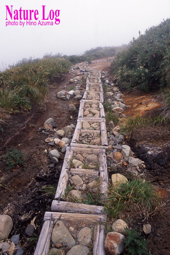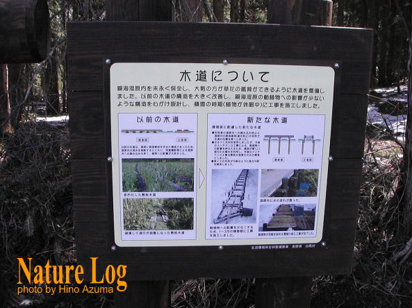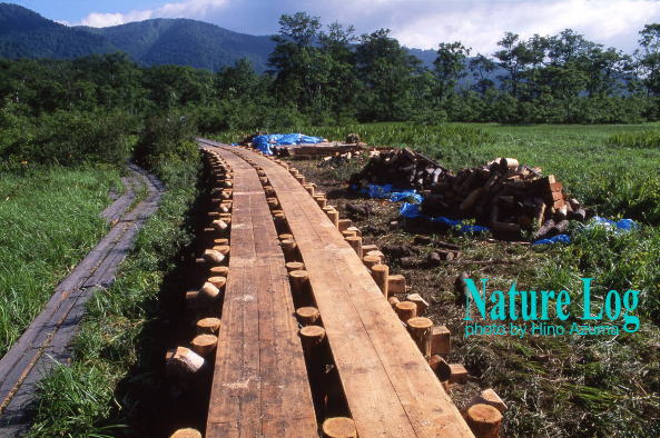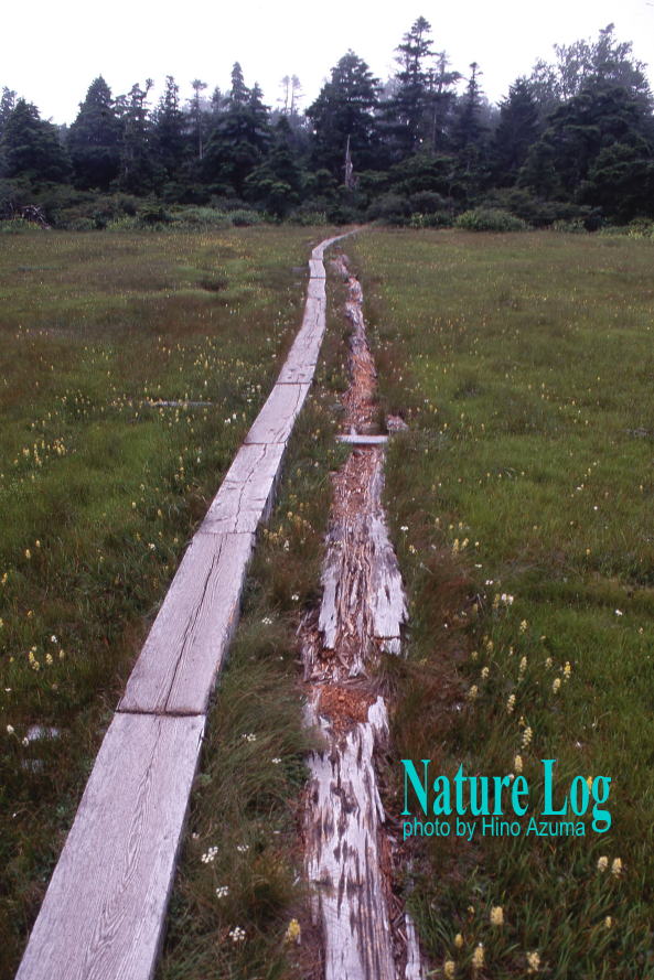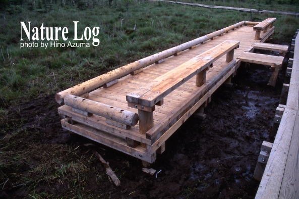 ![]() 泥を被った木道も足の置き方には注意する必要がある。状況次第で滑ることも。至仏山登山道で。 ![]() 志賀高原の、ややマイナーコースで見かけた木道。表面は濡れて落ち葉が覆い、縁は苔むし、滑り止めもなく、いかにも滑りそうな雰囲気にあふれていた。さすがに普通に歩く気にならず、四つん這いになって、そろそろと通過した。撮影は2023年。 ![]() スリップ防止のために一定の間隔で横木を渡した木道。これなら仮に滑っても、横木間だけですみそうだが、木道工事の手間は倍増しそうだ。苗場山で。撮影は2000年。 ![]() その苗場山の木道に取り付けられていた木道工事の国立公園整備事業票。環境省による事業だが、施行は長野県が行ったようだ。こうした事業票は、木道ごとに必ずあるわけではない。撮影は2017年。 ![]() 谷川岳の天神尾根登山道にも一部、同様の横木を渡した木道があった。撮影は1998年。 ![]() 立山の松尾峠に続く登山道では、木道に細い溝を彫り込む方式によるスリップ防止加工がされていた。おそらく横木方式の方がスリップ防止効果は高いだろうが、設置者の配慮に感謝したいところだ。撮影は2008年。 ![]() 乗鞍高原の女小屋の森にのびる桟道表面には金網が敷かれ固定されていた。これなら確かに滑りにくい。林間の桟道はどうしても湿っぽくなり、表面に苔や藻類、菌類が繁殖して滑りやすくなる。なので、こうした対策は大変有効といえるだろう。訪問者からクレームがあって後付けしたのかもしれないが、どちらにしてもベストな方法だと思う。撮影は2023年。 ![]() 複線の木道に柵まで整備。手間とお金がかかっていることを伺わせるが、それだけ快適な散策ができる。岩手県八幡平市・八幡平で。撮影は2002年。 ![]() 片側だけに重厚な柵が付けられた木道。これほど立派な柵であれば、撮影時には三脚代わりにもなりそうだね。秋田県大館市・芝谷地。撮影は2002年。 ![]() 新設されたばかりの複線木道。左側に写っている木道が旧来のものだが、木材を湿原上に敷くだけだと、特に夏場は木材が太陽の熱で温められて、湿原の乾燥化に拍車をかけたり、水の流れに影響を与えたりと、マイナス面も指摘されている。この場合はどんな理由で、支柱方式が採用されたのか不明だが、支柱で木道と湿原の間を空けることで、影響を少なくできるのも間違いない。工事直後で、まだ関連資材が置きっぱなしになっていた。尾瀬ヶ原で。撮影は2001年。 NEW ![]() 湿原環境に影響が少ない構造の木道に再整備したことを説明する長野県白馬村・親海湿原(およみしつげん)の解説板。以前の木道は、湿原表面に板を置いただけの敷板木道だったため、湿原内の水の流れを遮断していたが、木道を高くすることで水の流れが戻ったとある。しかも動植物への影響を少なくするため、積雪期に工事をしたという。大変結構なことだ。撮影は2005年。 NEW ![]() 湿原入口に山と積まれた木道部材。木道はどうしても腐食するので、時々付け替える必要があり、その際は大量の木材が必要になる。コンクリートや樹脂でも代用はできるだろうが、やはり風情という意味では木材に代わるものはないだろう。北アルプス・立山の弥陀ヶ原で。撮影は2008年。 ![]() 木道工事に際して登山者に注意喚起するため設置された看板。新潟県魚沼市・平ヶ岳の中ノ岐林道入口で。この工事では、ヘリコプターで古い木道は搬出されてチップとして再利用される予定のようだ。撮影は2016年。 ![]() 木道ではないが、戦場ヶ原に新設されたばかりのテラス。これほどの構造物を設置するのに湿原を踏まずしてできるはずもないから仕方ないが、テラス周囲は踏み荒らされ、ほぼ植生は消えていた。その後、植生は再生していたが、こうした構造物が湿原生態系に及ぼす影響について、いずれ検証する必要があるだろうね。撮影は2000年。 ![]() 戦場ヶ原で見かけたフロート(浮き)付きの木道。フロートがなければ沈むってこと? 撮影は1998年。 ![]() これもある意味、木道である。丸木を組んで、中に現場の石を集めて詰めてあった。滑りにくいので、こうした方式もいいと思う。秋田県仙北市・笹森山。撮影は2002年。 ![]() 朽ちかけている木道(右)と、更新された木道(左)。周囲を彩るのはキンコウカ。平ヶ岳の木道工事のように本当は朽ちかけの木道は、そのままにするのではなく回収して処分する方がベストだろうけどね。福島県舘岩村(現・南会津町)・田代山。撮影は1999年。 ![]() 普通の登山道に枕木のような木を並べた道。山には、こういう道って割とあるんだよね。すべてではないが、横木を渡してあった。群馬県草津町・草津白根山。撮影は1999年。 ![]() 極めて立派な桟道。ここまでしなくてもいいんじゃないかという意見もありそうだが、確かに歩きやすかった。というか、ここだけ山の登山道というよりも公園の遊歩道を歩いているようだった。相当にお金がかかっているだろうな。奈良県上北山村・大台ヶ原。撮影は2001年。 ![]() 遊水地