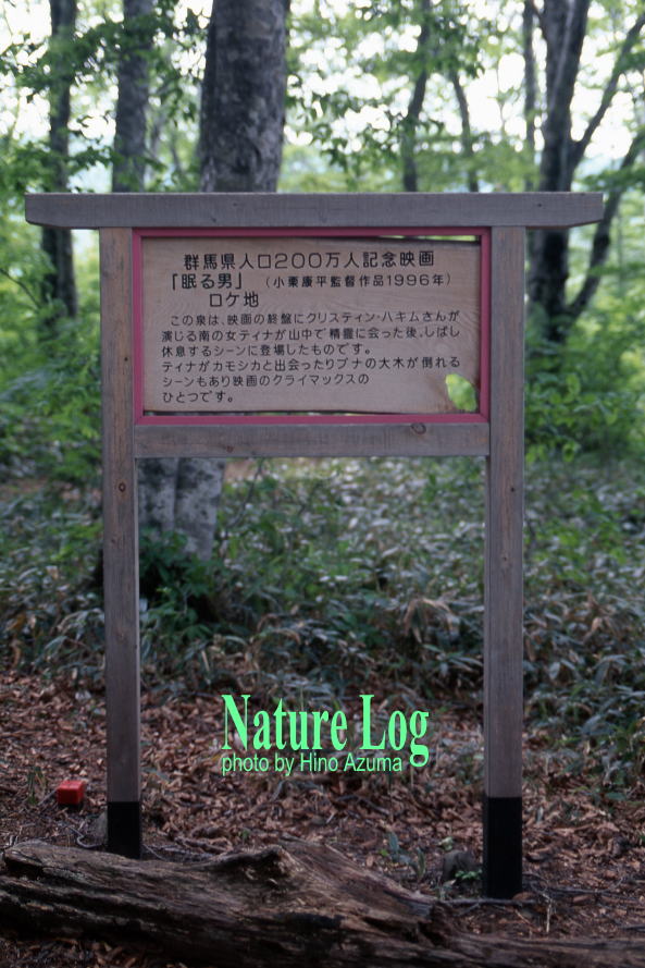 また武尊自然観察遊歩道では、群馬県の人口が200万人を突破したことを記念して県も関わって1996年に製作された映画『眠る男』のロケ地解説板を見かけた。これによると映画のクライマックスシーンのロケ地だったようだが、確か入口の駐車場から約2.6キロほど奥に入った田代湿原付近にあったと思う(現在もあるかどうかは不明)。映画製作前に行われたであろうロケハン(ロケーション ハンティングの略で撮影場所を探すこと)で、ひょっとすると県内のいくつかの候補地を実際に歩いて適地を探し出したのかな、と想像した。また当然のことながら撮影当日は大勢のスタッフや俳優が歩いてここまで来て撮影したのだろう。