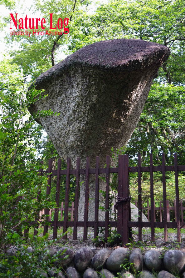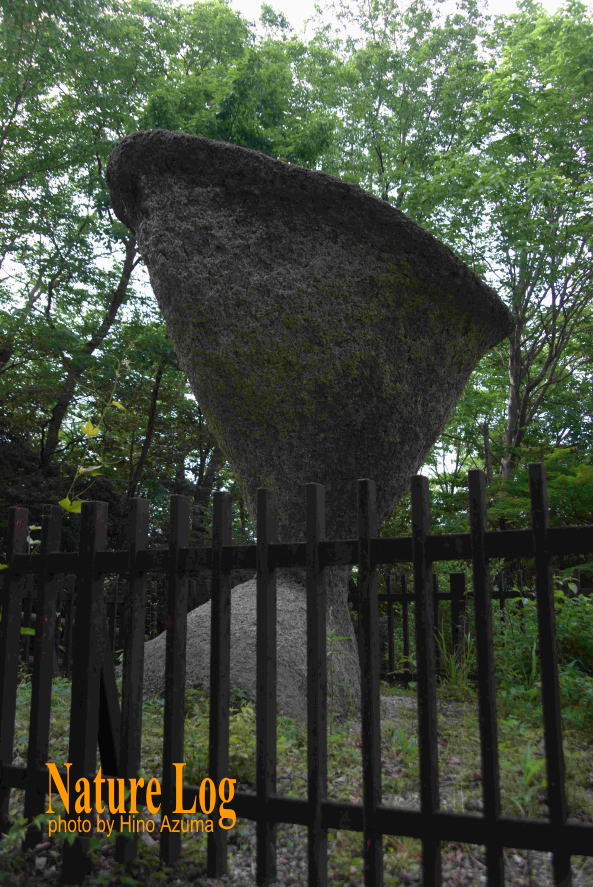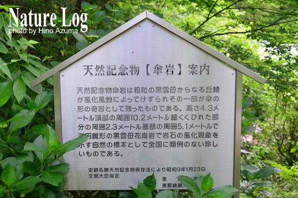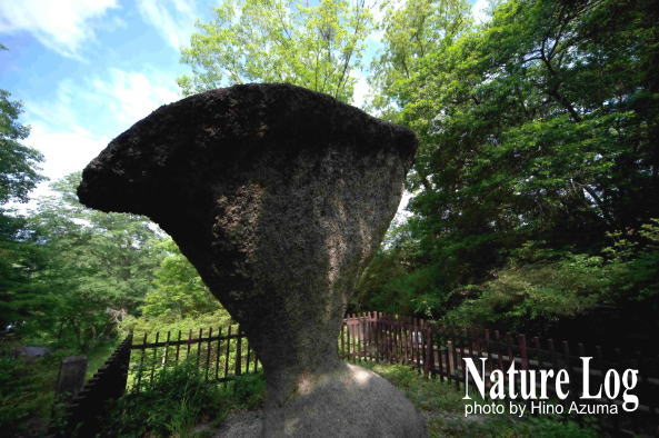 確かにこの傘岩も風化しやすい花崗岩ではある。しかし現地解説碑の「風蝕と雨蝕による」との説明だけで「納得せよ」といわれても無理。風と雨の浸蝕だけで、ここまで不安定かつ異様な形状になるだろうか。もし過去に水位が頻繁に変化するような湖沼とか川とかの中にあったと仮定すると、水没する時間的比率により風化進行に差が生まれ、下部が段階的に削られて、こんな逆円錐状になったと推測できなくもないが、先にも書いたように国土地理院地図で確認しても周囲よりも比較的高い丘陵地にあり、過去はどうだったかは不明であるものの、川の中にあった可能性は低いかもしれない。成因は謎である。