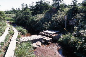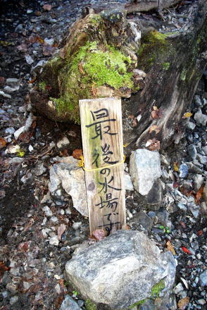 北海道・雨竜沼湿原登山道途中の水場。白竜の滝を過ぎて急登を越えたところにある。撮影は1995年(左)。北アルプス・徳本峠手前にある最後の水場を示す手書き看板。上高地側から白沢沿いに登ると、峠に到着する少し手前に水場がある。「最後」というのは上高地側から登る場合。撮影は2005年(右)