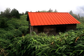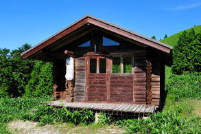 兵庫県新温泉町。上山高原の上山高原避難小屋。全線舗装された海上(うみがみ)林道沿いに建っている。撮影は2011年。
