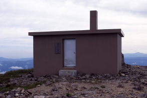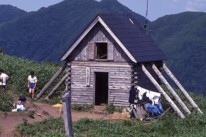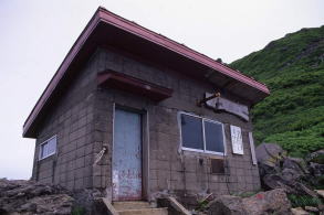 栃木県・鬼怒沼巡視小屋。東京電力が登山道巡視のために建てた小屋で、避難小屋としても利用できる(左)。志賀・岩菅山頂避難小屋。1995年撮影。最近の写真は上に掲載(中)。カマボコ型の谷川連峰・茂倉岳避難小屋。写真は先代の小屋で、1989年撮影。新しい小屋は木造で、外観はがらりと変わっている。ちなみに谷川連峰・一ノ倉岳避難小屋も同じカマボコ型(右)。