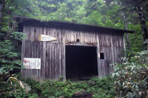 谷川岳の天神尾根にある熊穴沢避難小屋。2003年撮影(左)。北アルプス・高瀬渓谷の名無避難小屋。入口には確かに「名無避難小屋」とあり、「名無」という名前があるのに「名無」とはこれいかに? 全国でもここだけというパラドックス的な避難小屋(笑)。付近の名無沢という名の沢名に由来する。2018年撮影(右)。