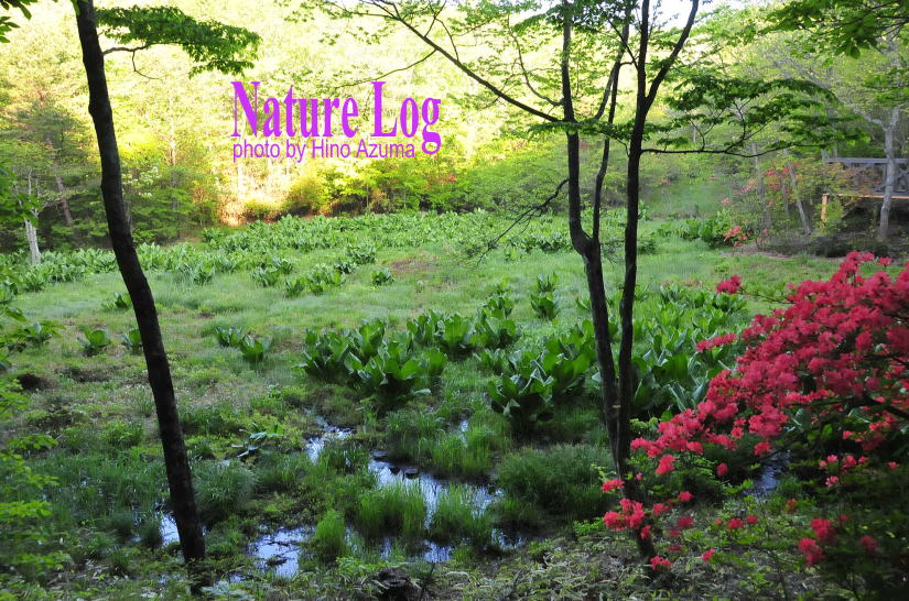 ![]() 大きな葉を広げているのはすべて植栽のミズバショウ。ツツジはヤマツツジ(2010.06) |