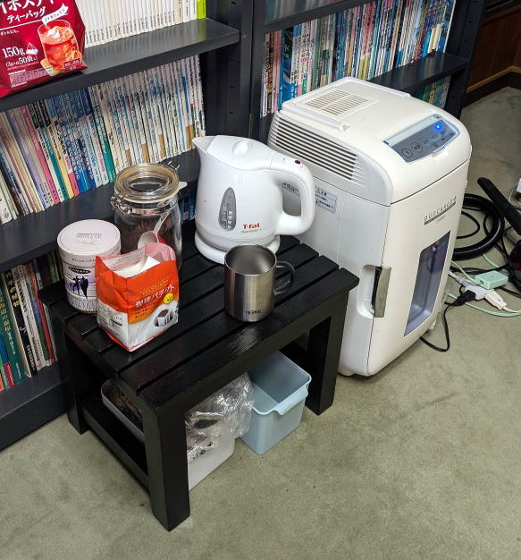 仕事部屋には電気ポットがあって、好きな時に温かいコーヒーや紅茶などを飲めるようにしている。以前は小さな椅子の上に電気ポットを置いていたのだが、いかんせん狭くて、うっかり倒しそうだった。そこで少し余裕を見た寸法で専用の電気ポット台を作ったところ、コーヒーを抽出する作業もしやすくなった。自作は手間がかかるが、自分の望むプランと寸法で好きな形にできる点がいい。 |