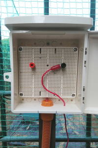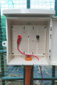 ↓右下のボックスには出力線とアース線を分岐させる端子台が入っている。出力線は3本のcd管を通って、各畑までのびている。