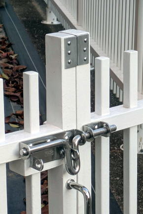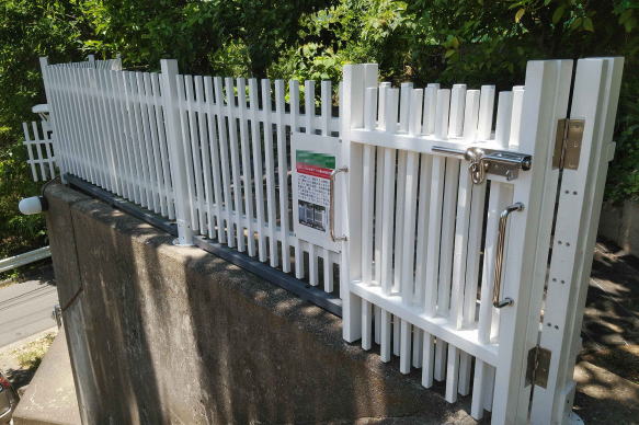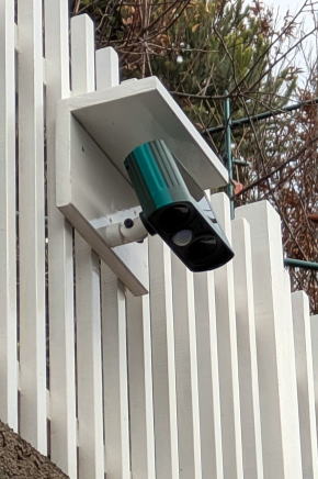 ![]() 西側階段降り口に設置した「開閉情報スマホ通知機能付き門扉」。右側の柵が「全長20メートルの柵」。左側の柵が今回、延長した柵。検針等で来宅した人のために案内板も設置。門扉の右側戸は、丸落としで普段は固定。必要に応じて、丸落としを上げれば内側に開くようにしてある。左側2枚の戸は折れ戸。ステンレスのカンヌキと取っ手もつけた。右下の井の字状のものはノラネコブロッカー。これがなければ、支柱の縁を抜けて柵の下をくぐって侵入される。 ![]() 今回作った門扉と柵の全貌。柵から出ているのはネットワークカメラ。LANケーブルで有線接続してある。一番左側に見えているのはかつて父と一緒に作った古い柵。父との想い出でもあるので、少し短くしたものの、記念に残しておいた。 ![]() ネットワークカメラは縦材の間を空けて屋根付きで取り付けた。右下のものは人感センサー。夜は反応すると壁面の階段灯が点灯する。カメラの裏側にプラスチックボックスがあり、内部でLANケーブルと電源ケーブルと接続。2口の電源コンセントがあり、階段灯のプラグを抜けば、AC電源をとれる。 ![]() 左側の折れ戸を開けたところ。門扉は柵と違って、折り畳みやすいように縦材が横材を突き抜ける構造にした。柵下のダークグレー色のバーは、これもノラネコブロッカーだ。下をくぐって侵入されるのを防ぐためのもの。
