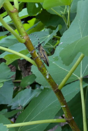 うちには、結構大きな西洋イチジクの木があって、たくさん実がとれるのだが、害虫のカミキリムシの被害も多い。そのため毎年春、葉の展開前に幹に果樹用穿孔害虫殺虫剤(住友化学のガットサイド)を塗ってはいるのだが、塗りきれない細い枝には、やっぱりカミキリムシが来て被害を及ぼす。そのため時々、来ていないか確認して、見つけた時は手で捕まえて殺していた。しかし、捕らえようとすると、逃げられることもある。飛んで逃げることも稀にあるが、下に落ちることで、逃れようとすることも多い。なので下に落ちたときは、地面のどこにいるか探す手間が生じる。 |