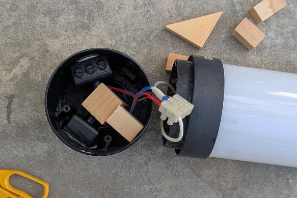 当然、この隙間からの雨水の浸入はあるだろうが、浸入した雨水はそのまま庭園灯支柱内部を伝って流れ、最後は支柱底部の隙間から土中に浸透して終わり。センサー筐体内部に水が入らなければショートしたりすることもないので、こんな大雑把な対策でも問題は起きないだろうというわけよ。なので非防水の屋内用センサーでも屋外用として使用することは可能なのだ。