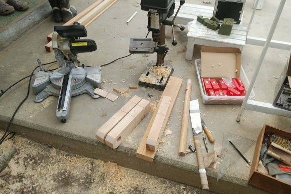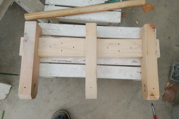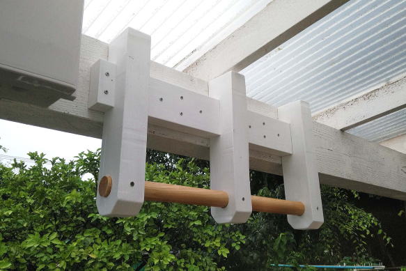 ![]() バーゴラ梁に取り付けた懸垂器。長い木ねじ12本でしっかり固定すれば、体重をかけてもビクともしない。 ![]() 「棒」を支える部材に切り込みを入れているところ、ベース材が、その切れ込みに入ることで3本の部材を支える構造にした。 ![]() 「棒」自体も動かないように木ねじで固定する。そのための穴も開けた |
