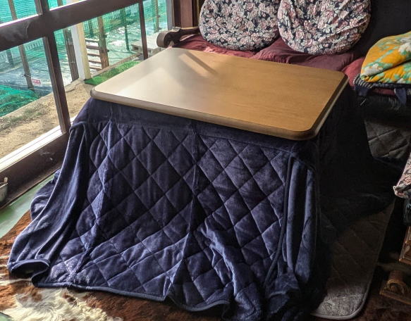![]() 自作テーブルに炬燵布団と天板を載せて完成。いつものようにソファに座って炬燵に入れる。敷布団はソファのクッション下に挟み込んで、ソファの下から空気が入りにくいようにした。これで特に支障はない。 |