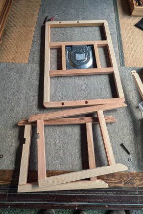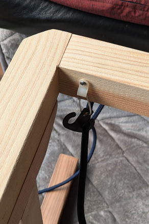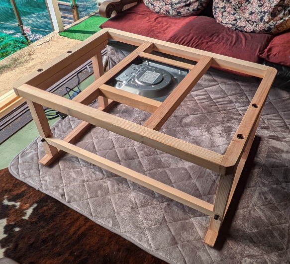 ![]() 4.5センチ×4.5センチの角材で天板よりもひとまわり小さい寸法で作る。テーブルは重い方が安定するので、故意に太い材を選んだ。本体と脚、脚と梁は、どちらも六角穴付きボルトで固定-取り外しができるので、収納もしやすい。最近のヒーターは薄型がほとんどなので、昔のヒーターのように足に当たって邪魔にならない。またソファ側の脚は内側に引っ込ませてあるので、炬燵に入る時にいちいちテーブルを動かさなくても足を入れやすい。