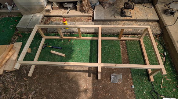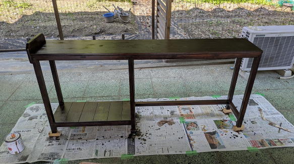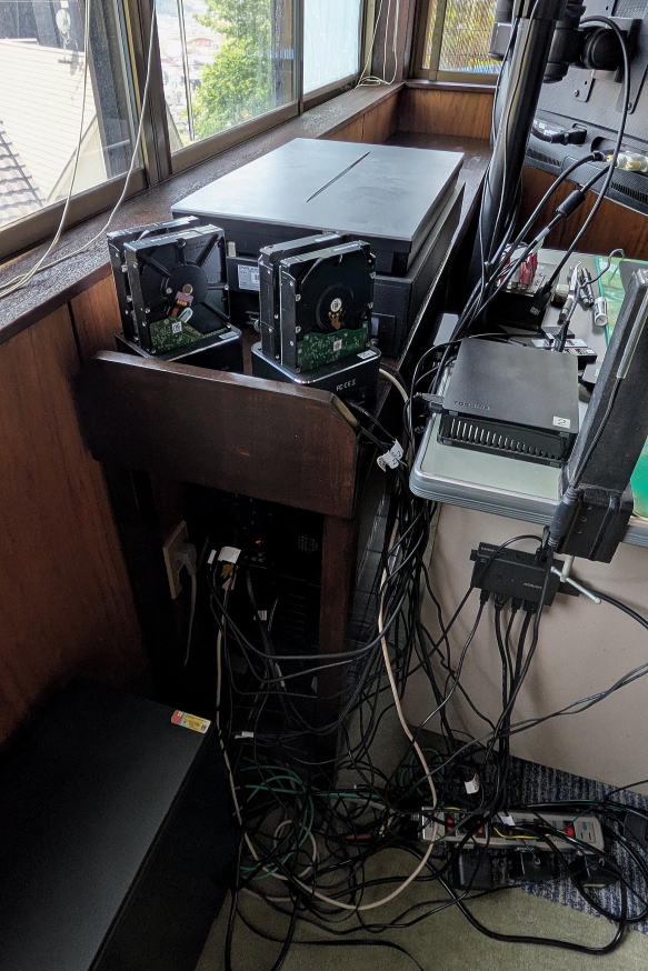 ![]() 脚6本と梁長短4本を切り出す。上に写っているのが天板用集成材。 ![]() 脚と梁を組んでいく途中。天板下には3本の補強用梁を追加。脚と梁は二段穴に木ねじを通して固定し、ねじ頭が見えないように丸棒材で隠し、サンダーで段差をなくした。 ![]() 天板と梁の固定方法。天板裏10ヶ所に固定用角材を接着する。横方向にねじ止め用穴が開いていて、それぞれ矢印の方向から木ねじを差し込んでねじ止めするようにした。この方法であれば、固定するために天板表面に穴を開けなくていい。 ![]() 塗装して完成。この手の着色塗料は、垂れたことに気づかないまま、少しでも時間をおくと、跡が残ってしまう。いくら塗料を重ね塗りしても、垂れた跡を誤魔化せない。こういう時はその区画だけ電動サンダーをかけて再度塗りなおせばいい。ちなみに左端はHDDスタンドや外付HDDを置く予定なので、なにかのきっかけで落ちないように板を取り付けた。また左側のパソコンが載るラック部分は、以前ホームセンターで買ってきて倉庫で眠っていた格安国産ヒノキ材を使った。偶然、幅寸法はピッタリだった。 ![]() 仕事部屋に搬入設置。新しいPCをラック部分に置き、上には今もポジフィルムのスキャニングに多用しているスキャナーを配置。テーブル下にはコンセントを延長して取り付けた。 ![]() デスク裏側から見たところ。2台のHDDスタンドなどを置いてケーブル類を配線。ちなみに配線する時はわかっていても、少し時間を置くと、それぞれのケーブルがどこにつながっているのか、ここまでゴチャゴチャしていると確実にわけがわからなくなる。そこで私はすべてのケーブル類に、例えば「ルーター」「HDDスタンド1」「新PC電源」みたいなことを白ビニールテープに書いて貼っている。それを見るだけで、どこへつなげるケーブルか、一発でわかるようにしている。左下は先代PC。一応、復活したが、やっぱりおかしい。この写真撮影時は、まだ先代PCは生きていたが、その後、使い続けることを完全に諦めた。SSDやHDDを取り出し、SSDはフォーマット。500GBなので、やや中途半端な容量(TBレベルでないと使いづらい)だが、捨てるのはもったいない。いずれ何かに再利用しようと思う。 |